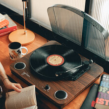 赛塔林(syitren)T400 黑胶唱片机 复古留声机 胶片唱机 蓝牙链接 动磁唱头 内置音响锂电池 七夕情人节礼物 木纹棕 黑胶唱片机